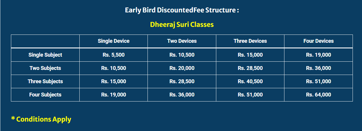 | Single Subject | Rs. 5,500 | Rs. 10,500 | Rs. 15,000 | Rs. 19,000 |